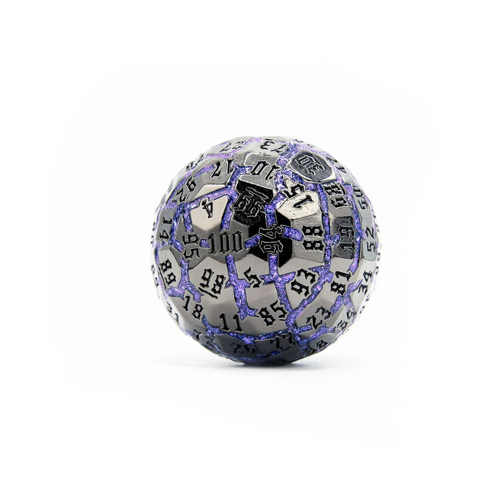Unleash the power of your magical abilities with the Arcane Steel: 50mm Metal D100 in Black with Purple Mica Cracks, a dice that not only aids in your mystical quests but also elevates the arcane ambiance of your Dungeons and Dragons gameplay.
