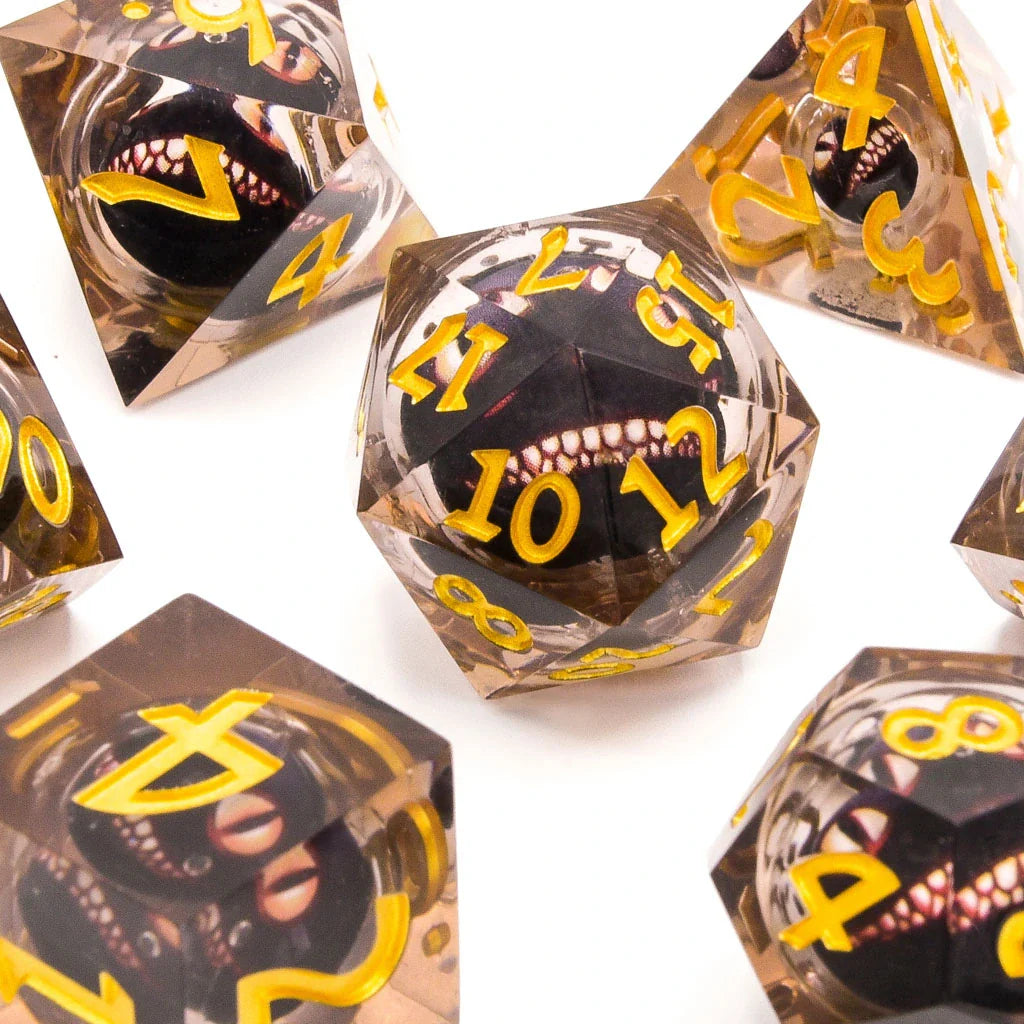 Each die in the Dark Mischief set is a gateway to the uncanny, with a malevolent creature’s face poised within a liquid core. As these dice roll across the table, the faces move smoothly, their grins wide and teeth bared, always settling with their gaze piercing upwards. This menacing presence is perfectly suited for games that dance on the darker side of fantasy, enhancing the mood with every throw.