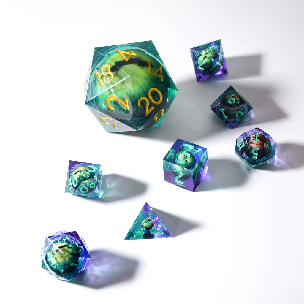 Encased within each die is a floating eyeball, suspended in a layer of frictionless liquid. As the die rolls, the eye twists and turns, always landing to glare ominously upwards. Choose from the malevolent stare of a dragon eye, demon eye, or human eye, each available in a variety of colours to complement your gaming experience.