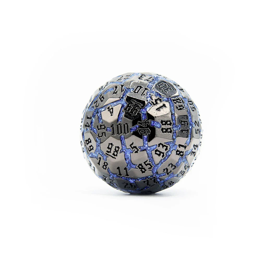 Venture into the chilling realms of your Dungeons and Dragons adventures with the Frostmourne Steel, a 50mm metal D100 that captures the essence of icy enchantments and frostbound magic. Featuring a deep black metal finish contrasted by bright blue mica cracks, this die embodies the visual effects of frost cracking through darkness, making it a striking choice for characters aligned with ice, winter, or the arcane mysteries of the cold.