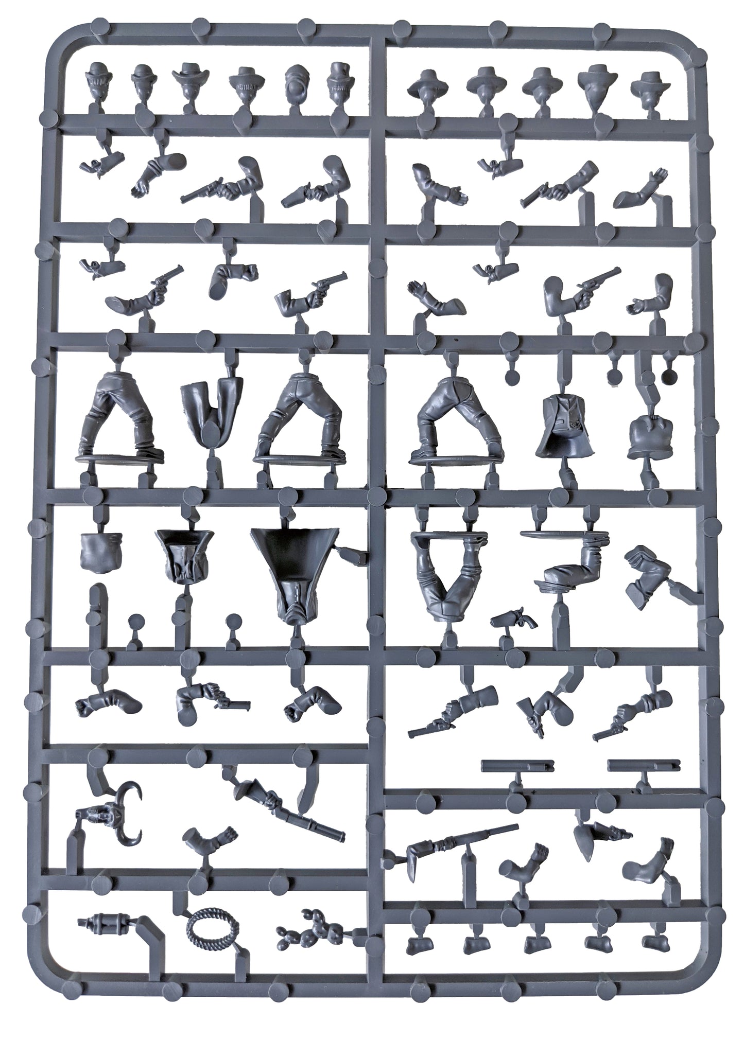 All the weapons you will need to arm your lawmen, bandits or cowboys are on the sprue, including pistols, a repeater rifle, two shotguns and a rifle as well as a host of other extras to make your gang truly individual. Plastic bases included.
