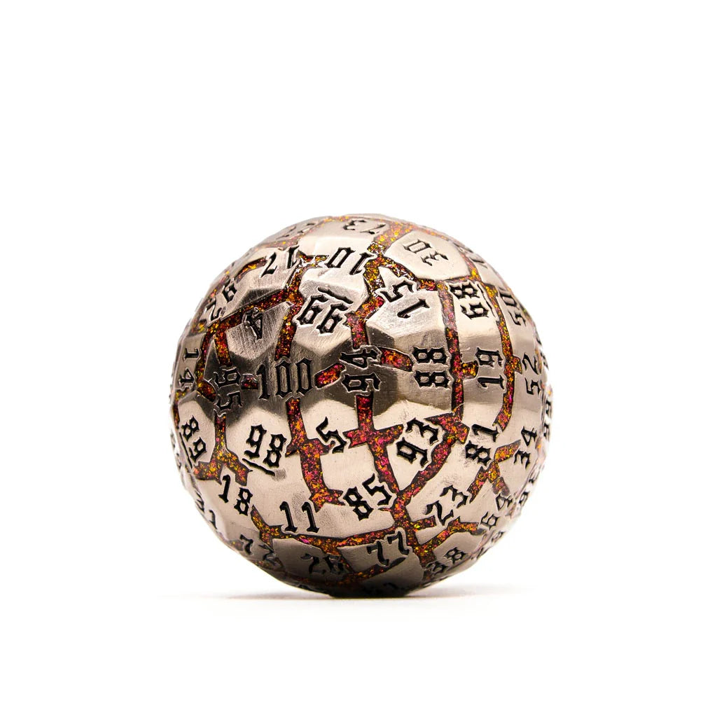 The Infernal Steel D100 is not just a functional gaming tool; it’s a statement piece. The dark silver metal, deeper in tone, suggests a forged item from the underworld, while the red mica cracks pulsate with an appearance reminiscent of flowing lava or the veiny glow of a demonic presence.