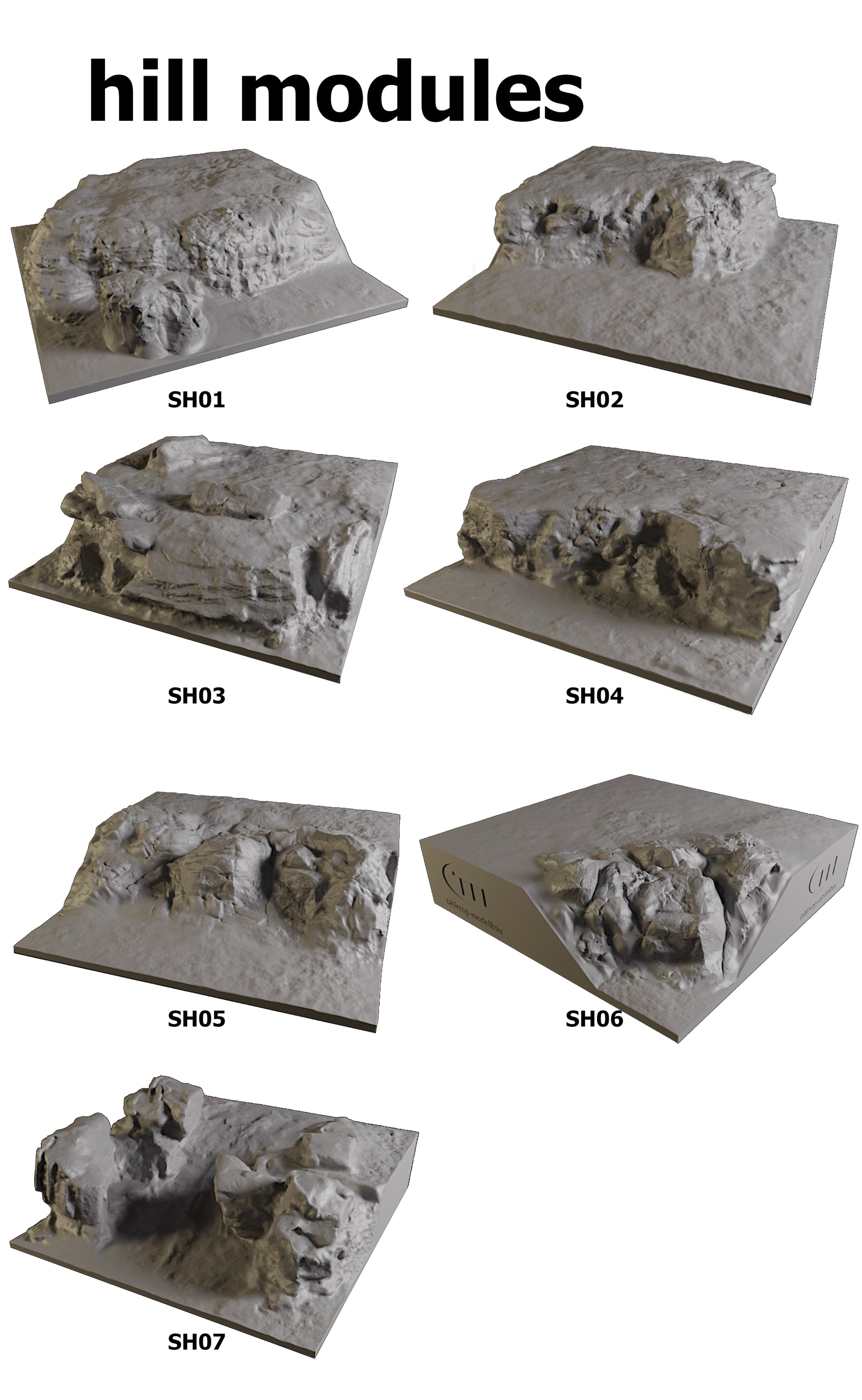 These 20cmx20cm or 8"x 8" modular terrain pieces are perfect for creating battlefield terrain for historical, fantasy or sci-fi table top wargames/RPG's. Tiles from different modules can be connected to create fully custom layouts, to suit your needs.