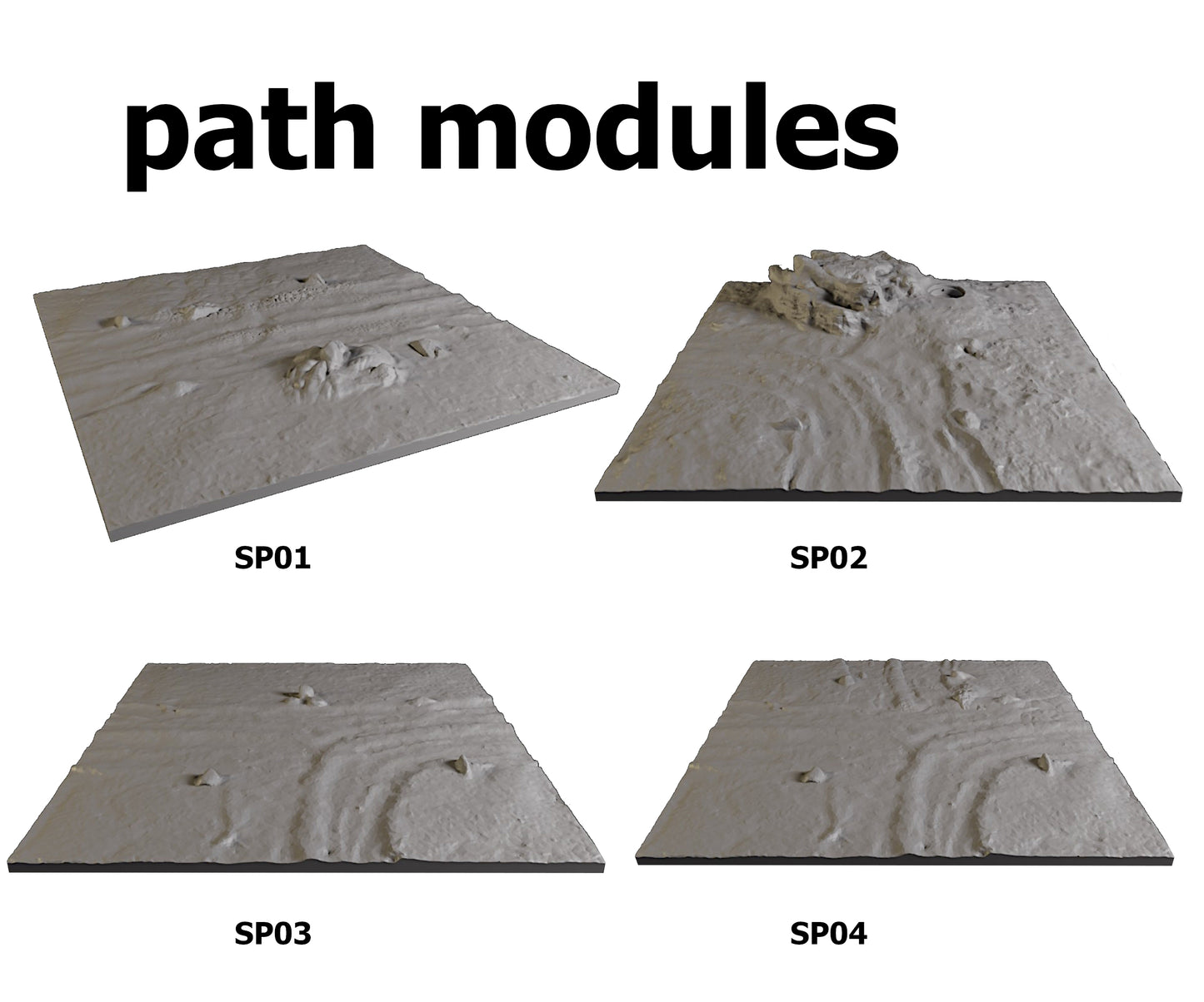These 20cmx20cm or 8"x 8" modular terrain pieces are perfect for creating battlefield terrain for historical, fantasy or sci-fi table top wargames/RPG's. Tiles from different modules can be connected to create fully custom layouts, to suit your needs.