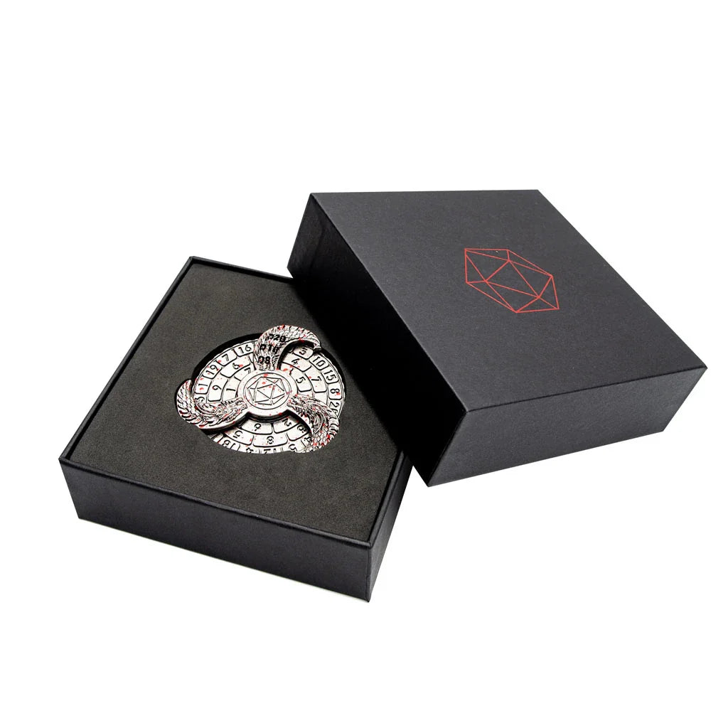 The core of the Prophecy Wheel is securely housed within a stunning zinc alloy case, adorned with an intricate dragon design and a prominent D20 motif at the centre. This robust metal casing not only protects the core and the bearing mechanism that allows it to spin freely, but also adds a touch of elegance and fantasy to your gaming setup.